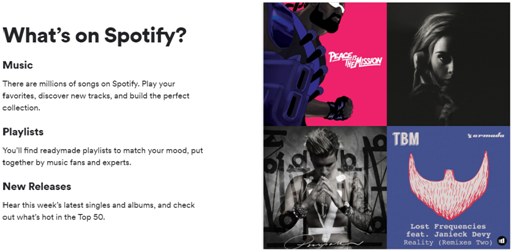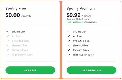 公司同时提供付费会员和基于广告的免费音乐服务,虽然苹果过去表示,免费模式将会损害音乐艺人的利益,不会长久;但是Spotify则认为,当下在线音乐市场仍不成熟,需要通过免费服务发展用户,在未来转化他们为付费会员。