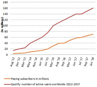 截至2017年12月,公司付费用户由2012年的500万增至7100万,月度活跃用户超过1.59亿,在去年第四季度,用户听歌时间合计为114亿小时;其最直接的竞争对手AppleMusic付费用户则仅为3600万。