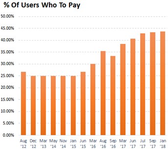 从下表中可以看出,公司的付费用户比例保持增长,但是明显低于公司的总用户增长。目前来看,公司付费用户占总用户的比例约为44%。然而其代价就是,公司运营支出大幅增长,从2016-2017年以来,公司研发成本增长91%,营销费用增长54%,管理费用增长50.8%。