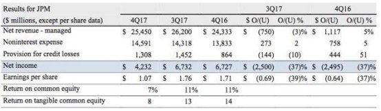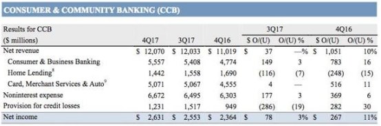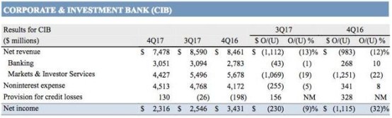 不计入特朗普税改的影响,摩根大通四季度65.6亿美元的净利润来源分别是消费者和社区银行(占比40.1%),公司和投资银行(占比35.3%),商业银行(占比14.6%)以及资产管理(占比9.9%)。