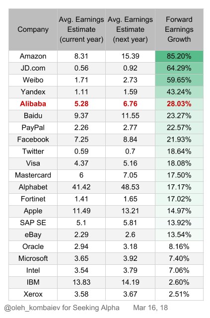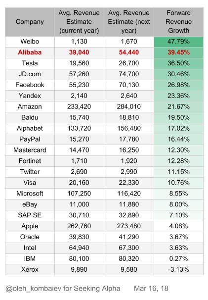 可以看出,分析师对阿里巴巴的平均预期是增长28%,比列表中的大部分公司要高。再来看看营收。