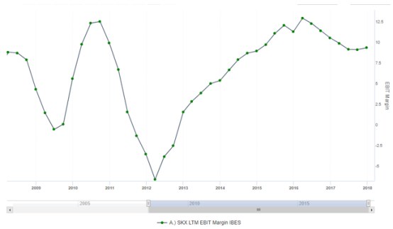 全球扩张和发展电商渠道能减少中间人成本,从而为公司带来更多利润。此外,斯凯奇在美国外其它市场能享受溢价,同样能使公司利润增加,而这点经常被低估。尽管如此,市场似乎并不认为斯凯奇能实现利润率增长,分析师预计公司2019年息税前利润率将为10.9%,2020年则将在12%至13%区间。