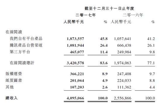 3月19日晚间,阅文集团发布截止于2017年12月31日的年度报告,2017全年公司营收40.95亿元,同比增长60%;经营利润5.1亿元,同比增长14.3倍;归属于股东的净利润5.56亿元,而去年同期为3668万元。