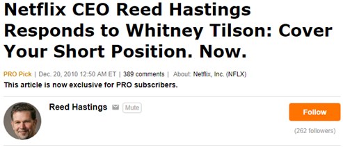 令人意想不到的是,仅仅再过了四天之后,奈飞的CEO里德黑斯廷亲自在Seeking Alpha上发表《谢谢你的爱,来一起上涨到三万英尺》,公开回复Whitney Tilson,建议其平掉做空仓位。