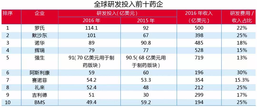 第三,从研发投入情况看,根据Endpoints News发布的2016年全球研发投入TOP15制药企业排行榜,Roche(罗氏)位居榜首,研发投入高达114.1亿美元,排名第10名的是BMS,研发投入49.4亿美元。