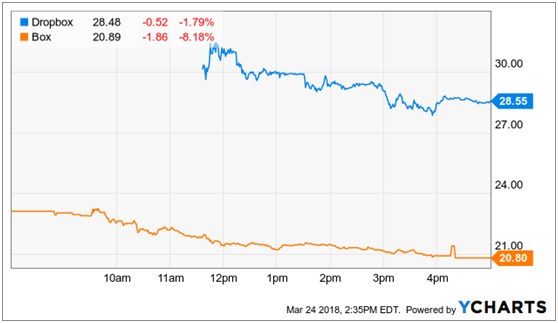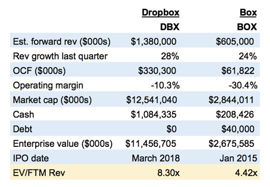 Dropbox现在的企业价值为8.3倍的预计收入(估计Dropbox 17财年收入为11亿美元,收入增长25%)。还要注意的是,上市当天Dropbox上涨36%,而Box下跌8%,加大了两只股票的价格差: