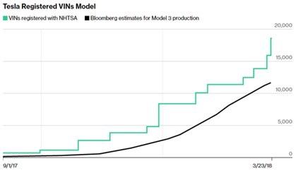 数据显示,到了3月,特斯拉的注册量增加到了每周约1000个,目前更是达到了每周2000多个。在3月份的前三个星期里,特斯拉共为Model 3注册超过4500个新的车辆识别码,公司产能似乎正在接近每周2000辆。此前特斯拉的目标是,让Model 3的产能在3月底达到每周2500辆。相比于花费了四年时间才让Model S和Model X的产量达到每周2000辆,Model 3似乎不到一年时间便能达到这一水平,从这一方面,也可以看出,公司在生产环节中的进步。