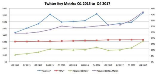推特的最大挑战是用户增长,因为它似乎停滞不前。2017年最后一个季度的3.28亿月活跃用户数量(MAU)与2017年第一季度基本持平。日常活跃用户(DAU)增长了12%,过去五个季度每季度增长了两位数。这表明,现有的用户群对于推特的黏性很高,但他们很难获得新用户,或者可以说很难留住新用户。