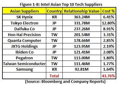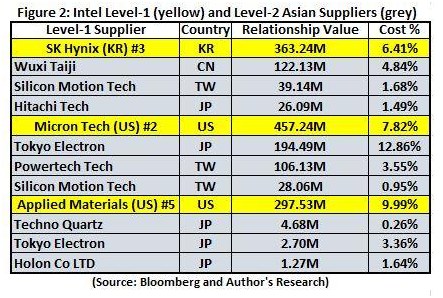 一级供应商为公司直接供应产品,加征关税的话增加的成本将能直接影响公司产品。下图列出了公司前十大亚洲一级供应商,成本分布占比最大的是东京电子(12.8%),最小的是三星(1.64%),整个亚洲供应商占公司总成本比例为43.76%,如果全部都征25%的关税,那么公司产品成本将对应上涨7%。不过考虑关税针对中国,前十大一级供应商不包括中国企业,中国最大供应商鸿海机密只占3.31%的比例,所以对中国加征关税对公司业务不会造成直接影响。