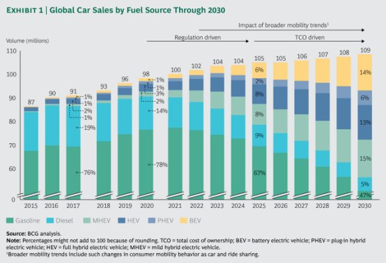 未来电动汽车的需求受政府管控预期的影响。制造电动汽车成本高昂,充电基础设施缺乏,购买历史并不久的电动汽车风险也不小,综合考虑以上三点,对大部分买车的人来说,电动汽车并不是个很好的选择。随着中国、挪威和法国纷纷设定停用汽油车的目标期限,多位分析师预计电动汽车未来将实现巨大增长。下图显示了波士顿咨询公司的预期情况。