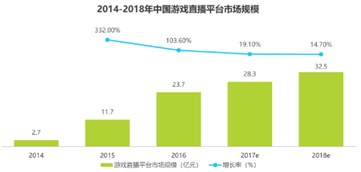 平台发展主要得益于我国直播行业近几年发展稳定,市场趋于理性,平台盈利需求变强;游戏产业发展迅速,市场空间拥有坚实基础,游戏直播平台进入精细化运营阶段。有机构预计,我国整体的游戏直播平台市场规模将在2018年超过30亿元人民币,增长速度达到19.1%。