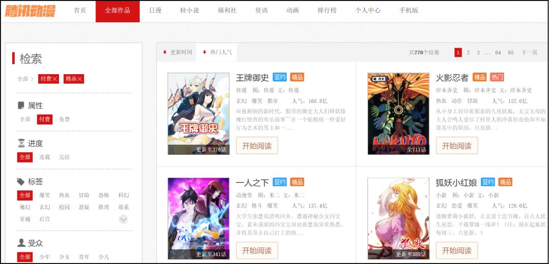 腾讯一直采用“原创+引进”的策略,即在引进优质日漫的同时,培养和发展国漫。《狐妖小红娘》、《一人之下》、《从前有座灵剑山》等大热国漫IP均在腾讯动漫独家连载,《全职高手》第一季在腾讯动漫播放量累计7.5亿,付费收入超过1400万,也是国内最大的原创动漫发行平台。