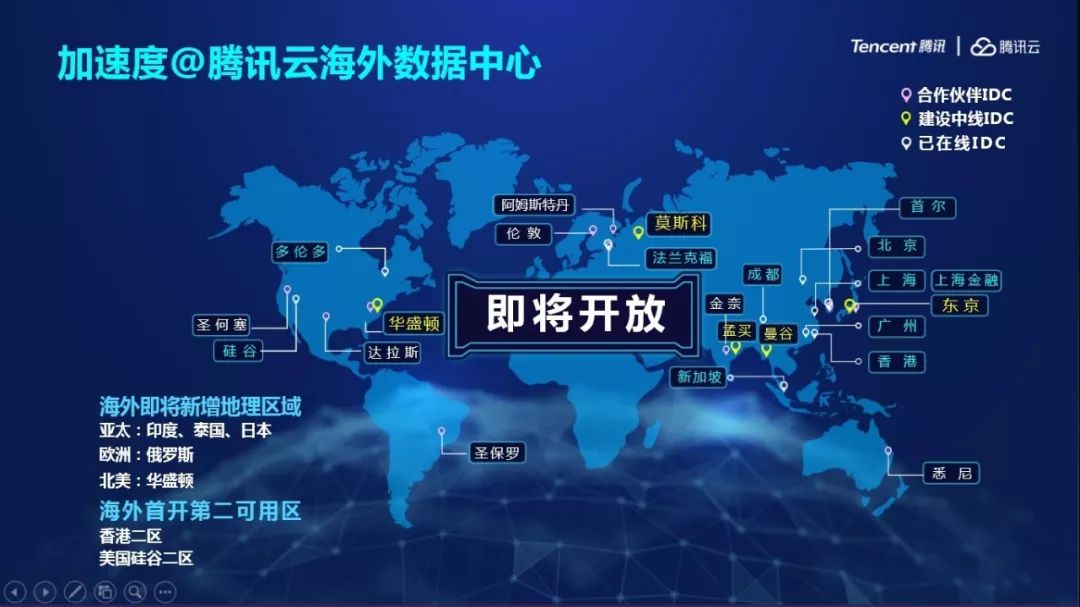 在基础设施方面, 2017 年底腾讯云已在全球开放 21 个地理区域,运营36 个可用区,即将再开放 5 个新地理区域。