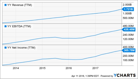 YY公司2017年的运营净现金为5.59亿美元,仅第四季度运营净现金就达到了2.14亿美元。资产负债表显示YY公司现金流非常强劲: