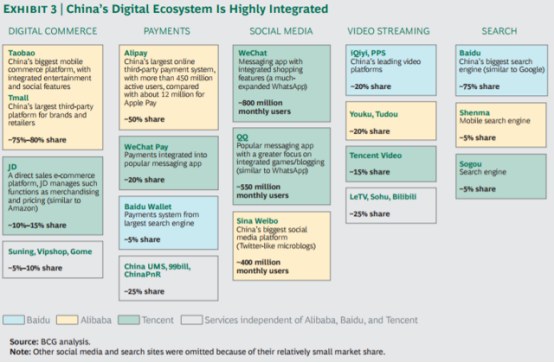 咨询公司BCG对中国的数字生态系统做了一个非常简洁的图表(见下图)。在这张图表中,中国从电子商务到社交媒体和流媒体视频的线上市场,是根据各品牌与BAT三巨头(百度、阿里巴巴和腾讯)的关系绘制的。以米黄色为代表的阿里巴巴经常被称为电子商务巨头,毫无疑问,它在数字生态系统的所有5个类别中均占据了强势地位。而绿色区域的腾讯通常被称为游戏和社交媒体巨头,但在这全部的五个类别中,它的实力也同样不容小觑。当然,腾讯在社交媒体领域的领导地位是无与伦比的,而阿里巴巴在电子商务领域遥遥领先。读者不必过于关注确切的市场份额百分比,因为这一数据是非常动态的,有时会有很大的变化。