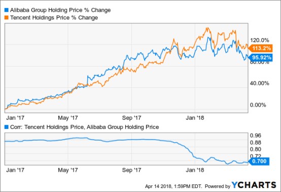 首先,看一看这两者一年内的股价涨幅,阿里巴巴和腾讯的股票表现都很好,尽管腾讯的涨幅已经超越了阿里巴巴。自2017年初以来,腾讯的股价上涨了113%,而阿里巴巴则上涨了96%。阿里巴巴和腾讯在2017年11月前后的股价变动几乎处于高度相关的状态。此后,它们股价走势之间的相关性已经从0.85下降至0.70左右(见下图)。