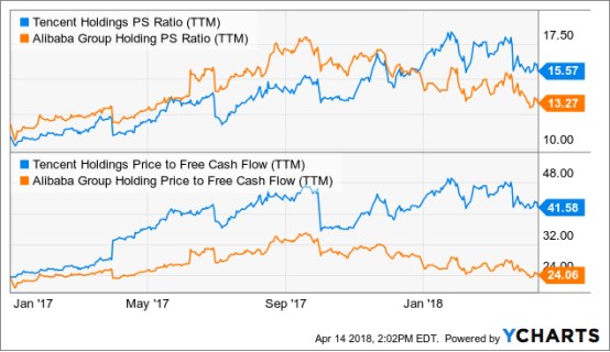 根据众多媒体的报道,阿里巴巴的竞争对手正越来越多地侵蚀其在电子商务和移动支付领域的主导地位。相比之下,腾讯在社交媒体和游戏领域的领导地位显然是不容挑战的。其结果是,目前市场只愿意给阿里巴巴13.27X的市销率(PS)(以12个月的销售业绩为基础),低于腾讯的15.57 x。这是自2017年11月以来的趋势逆转。下图中显示,腾讯的高价格自由现金流也表明了市场对腾讯与阿里巴巴之间的偏好。