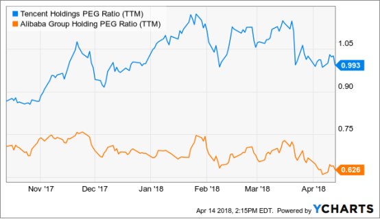 市盈率相对盈利增长比率(PEG)也说明了这一趋势。阿里巴巴的市盈率相对盈利增长比率为0.626X,而腾讯则高出50%以上,为0.993X。