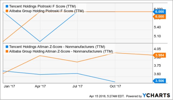 根据Investopedia的数据,Piotroski F Score是一个比较有名的评分系统,目标是选择出财务状况良好,整体运营进步的公司,其中9是最好,0是最差。这是一种有效的来对股票进行评级方式,因为其标准包括盈利能力、杠杆、流动性和资金来源、和经营效率等等。在这个评分系统中,腾讯和阿里巴巴都取得了6分,这是他们财务实力的证明。这对搭档也有健康的Altman Z-Score。Altman Z-Score是衡量一家公司破产可能性的指标。根据ychart的数据,分数低于1.81的公司破产的可能性相对较高。而阿里巴巴和腾讯的分数分别在3.506和3.984,很显然远离破产这一危险区域。