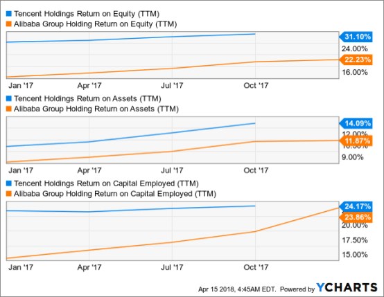 最后,看一看回报率的计算。在股本回报率(ROE)和资产回报率(ROA)方面,腾讯的表现远远好于阿里巴巴。尽管如此,在笔者认为更相关的指标上——净资本回报率(ROCE)——阿里巴巴可以说与腾讯不相上下。ROCE可以很好地说明一家公司通过利用其生产性资产来产生回报的实际能力,并且该指标可用于比较使用不同资本结构的公司。