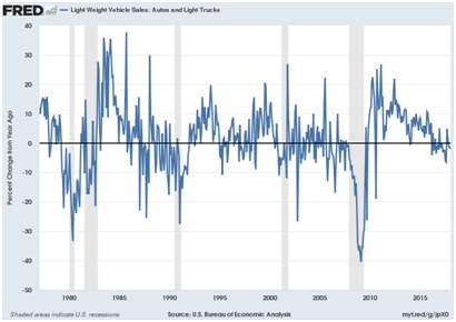 而同样以基年百分比变动来看,目前的汽车销售数据依然开始呈现下滑的趋势,如下图所示,结合上图可以发现,其实从2015年汽车销售数据达到阶段高峰之后,数据就开始显示出疲软的态势,最新的基年百分比变动数值为-2.1%。