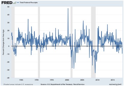 自2015年以来,联邦收入的增长具有明显的间歇性,而且经济增长水平与国内真实GDP评估存在差异。截止3月份联邦收入为2108.32亿美元,以基年测算,其数据为-2.7%,并且从下图可以看出,同样类似于汽车销售数据,联邦收入百分比数据从2015年开始增长疲乏。