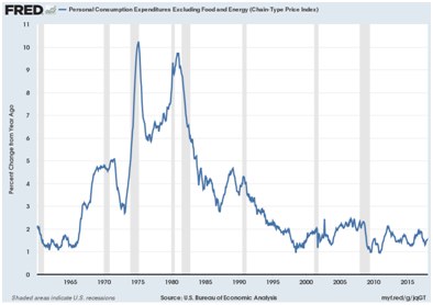 虽然最近关于担心通胀发生的言论增多,而且美联储也开始进入加息周期,但是政府更应该竭力预防通货紧缩,因为,通货紧缩的杀伤力明显大于通货膨胀,对市场和经济有着更为严重的影响,下图表示核心PCE物价指数,该指数能够反映由于价格变动使消费者购买替代产品的价格,被认为能更全面、稳定地衡量美国通胀,受到美联储的关注,目前,该数据为1.6%。