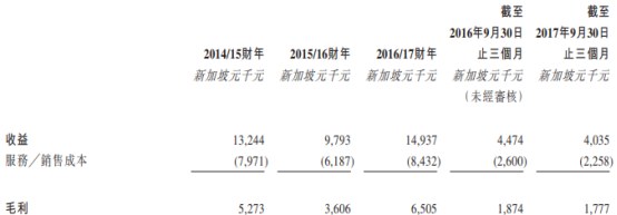 公司2015财年、2016财年及2017财年的营收分别为1324.4万新加坡元,979.9万新加坡元和1493.7万新加坡元。不难看出,公司近三个财年营收波动较大。2016财年的营收同比下滑约25.8%,2017财年营收同比增长52%。如下图所示,最近三个财年HKE Holdings的毛利率同样波动较大。
