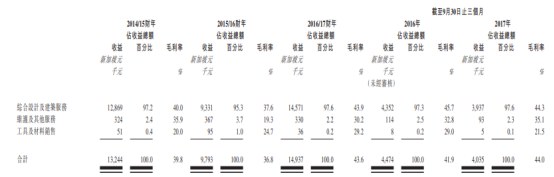 按不同业务划分,2015至2017财年期间,HKE Holdings的综合设计和建筑服务业务营收占公司总营收的比例超过95%。