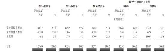 按照不同客户划分,公司58.7%的营收来自医疗设备供应商,25.6%来自承建商,剩下的15.7%则来自医疗服务供应商。