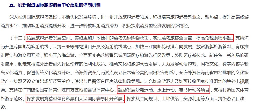 市场关注已久的“博彩”放开问题也包含其中。文件指出:“鼓励海南发展沙滩运动、水上运动、赛马运动等项目,探索发展竞猜型体育彩票和大型国际赛事即开彩票。”