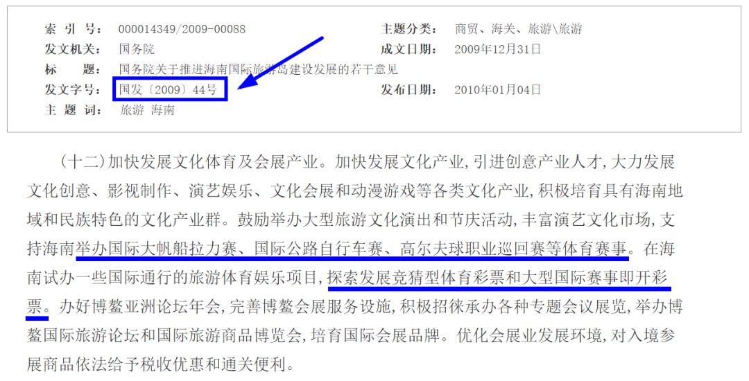 不过,类似的新闻和消息,早在8年前就有了。2010年,国务院发文《推进海南国际旅游岛建设发展的若干意见》,其中就提到“鼓励海南发展国际体育赛事,探索发展竞猜型体育彩票和大型国际赛事即开彩票”。