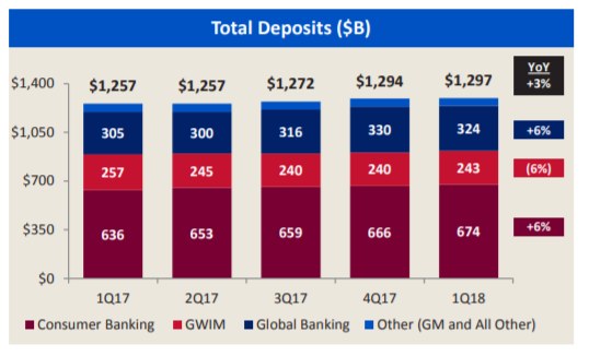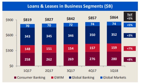 美国银行消费银行银行和全球银行部门一季度贷款同比增长3%,抵消全球财富投资管理部门的存款下滑之后还有剩余。