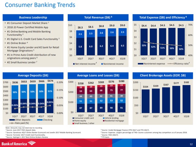 2018年美国经济持续向好发展,美国银行的消费银行部门从中获益不少。公司一季度该部门营收、存贷款以及客户经纪资产都同比大幅增加。