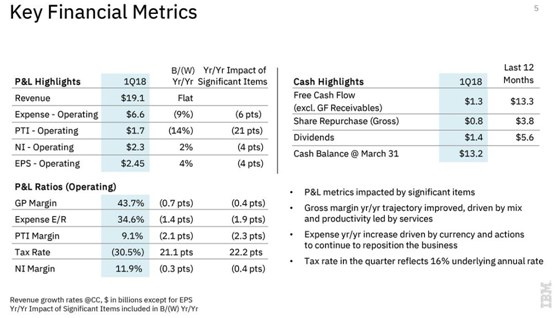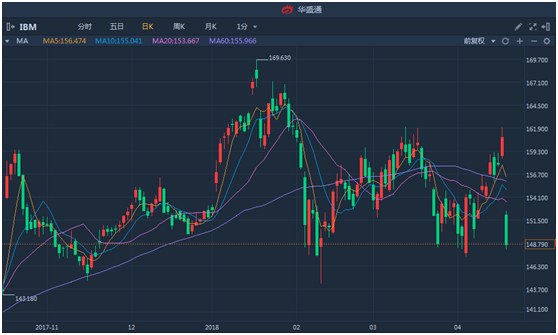 昨夜美股,IBM大跌7.5%,前一日,公司发布最新财报,一季度每股盈利2.45美元,收入190.7亿美元,双双高于预期。不过,该公司公布的前瞻指引低于预期,IBM预计今年全年利润为每股13.80美元,低于分析师预期的13.83美元。