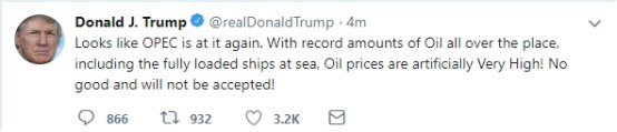 美国总统特朗普发推抨击石油输出国组织(OPEC),称其减产“人为”抬高了石油价格,并宣称此举“不会被接受”。特朗普推文称,“看起来OPEC又在故技重施。各处石油产量创下新高,海上油轮满载,石油价格却‘人为地’非常高!这没有好处,并且不会被接受。”特朗普发表这条推特后,原油价格走低。