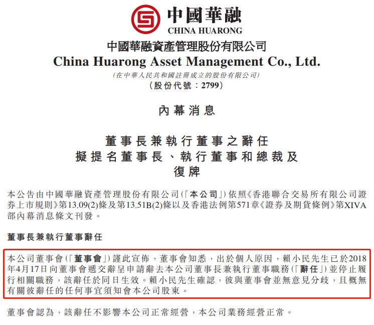 4月20日,华融发布公告,出于个人原因,赖小民于4月17日已向公司递交辞呈申请辞去董事长兼执行董事职务,该辞任于当日生效。