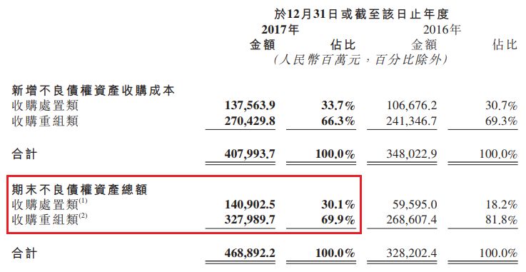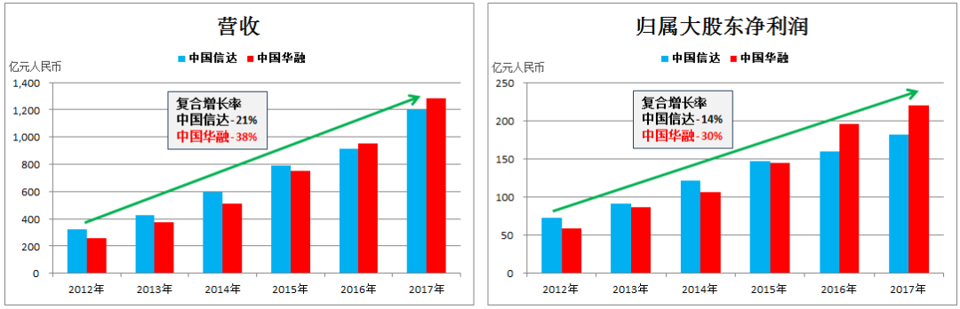 根据2017年业绩,华融总资产为1.9万亿元,信达约1.4万亿元;华融总负债为1.7万亿元,信达则约1.2万亿元,两者于过去5年复合增长率均约40%水平。