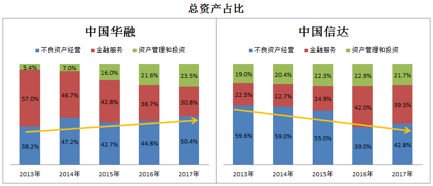 双方的不良资产占总资产比例出现明显的趋势差异:华融从5年前约38%提升至2017年50%;信达则从60%逐步下降至43%。