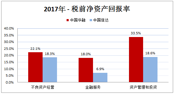 根据2017年数据,金融服务的回报率于三大业务中最低,被华融所舍弃也很合理,不过为何金融服务占比在信达中却一直在提高呢?