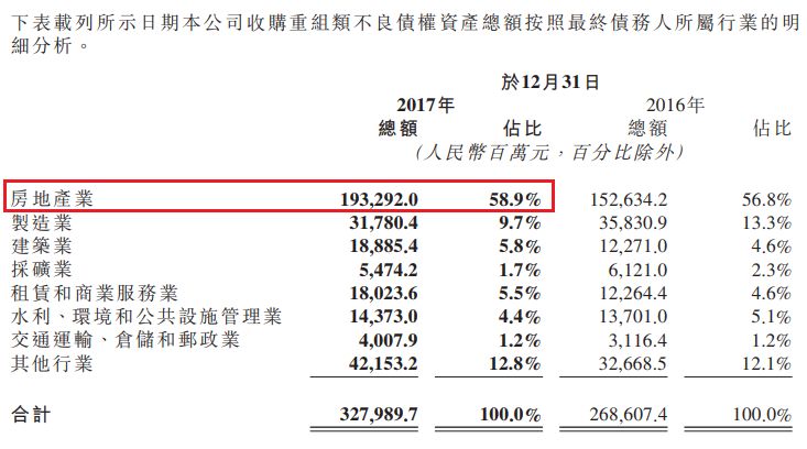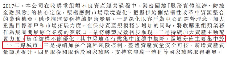 相反,信达大部分的不良债权资产虽然同样来自房地产,但总额只有1,100亿元,只及华融的一半,而且年报中又提到,区域分布主要集中于一、二线城市,风险明显较低。