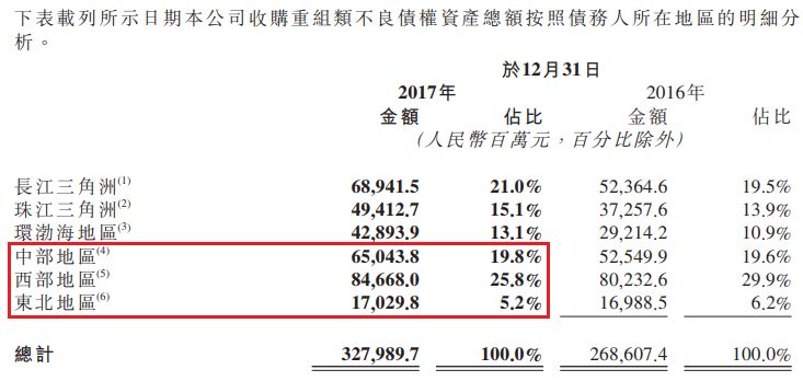 从不良资产的分布地区来看,中部、西部和东北地区的总比例占到一半。