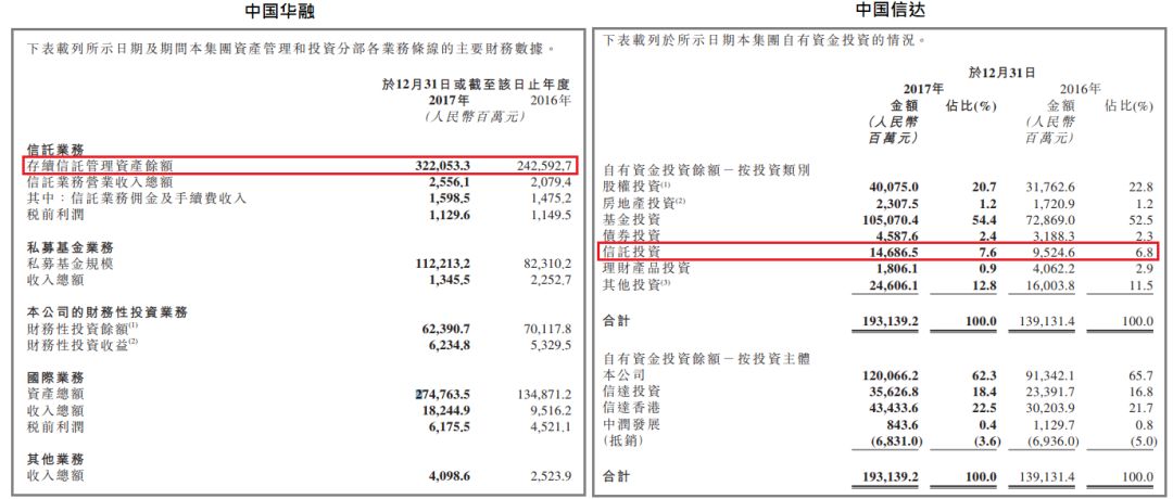 不过,作为国企的华融,2017年信托资产余额达到3,200亿元,大力投资于资管和信托产品,相反信达就乖乖的,不太愿意拈手信托,以自有资金投资的信托资产余额不到150亿元。