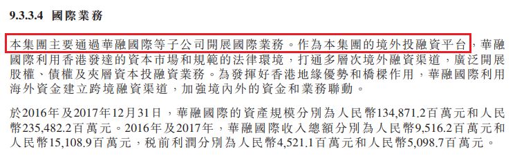 根据资料,华融的资产管理和投资业务主要投资于信托及国际业务,2017年相关资产余额达到3,200亿元;国际业务的投资亦达到2,700亿元。