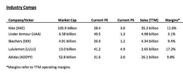 和同行估值相比,露露柠檬当前估值似乎略高。公司的各项估值指标在同行中均处于较高水平。投资者对露露柠檬出色业绩的预期似乎已经大幅反映在股价中。露露柠檬当前市盈率为41.2,仅低于安德玛。公司当前市销率为4.9,为同行中最高水平。