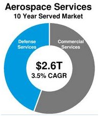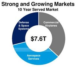 公司订单充足,第一季度公司订单储备达到5835架,预计未来全球航空业发展迅速,直接推动公司商用飞机业务的发展;而美国军费的提升,保证了公司国防业务的发展;未来全球服务市场增长迅猛,10年内预计将以3.5%的复合增长率持续发展,市场规模达到2.6万亿美元,加上商用飞机市场和国防市场,公司未来10年市场规模达到7.6万亿美元。