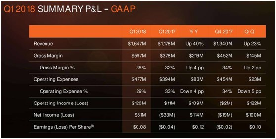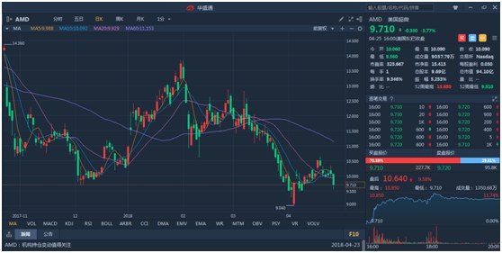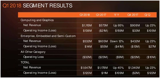 昨日盘后,AMD公布2018年第一季度超预期财报数据,公司股价盘后大涨。