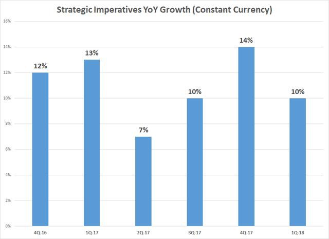 IBM很早以前就意识到公司的未来在于战略需求业务,尤其是分析和云业务,因此公司大力投入发展该业务,这就是公司战略需求营收如此靓丽的原因所在。该业务当前营收的总营收占比接近一半,且过去几个季度的增速都十分强劲,这是个好消息。