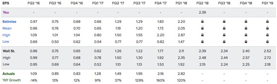 今年的第一季度财报展示了公司周期性业务的强大,通过下方华尔街对于公司盈利预测可以看出,公司EPS同比增长120%,是2017年第三季度以来,连续第三次呈三位数的增长,而且公司盈利随着全球经济复苏和大宗商品触底,从2016年以来呈加速增长的趋势。