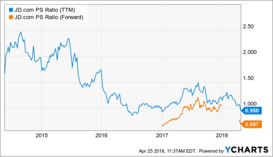 在一个12个月(TTM)的基础上,京东的市售率仅为0.95美元,而在远期的基础上则是0.687美元。在该股的交易历史中,现行的市盈率接近底部。
